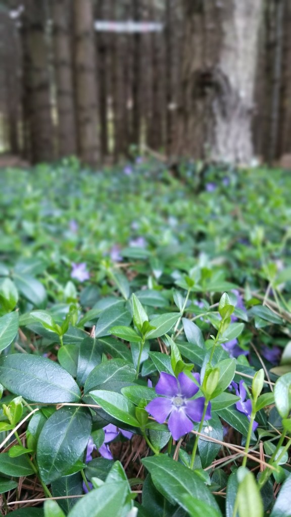 What I didn’t mention is that there is also a delightful carpet of in-bloom periwinkle as you walk toward the labyrinth entrance. Yes, I know it is technically an invasive plant species. And, no, I didn’t plant it–I suspect it has been in this spot for decades considering the size of the patch, expanding each year. But those glorious periwinkle flowers… somewhere between violet and indigo on the colour spectrum… sure can’t help but make you smile.