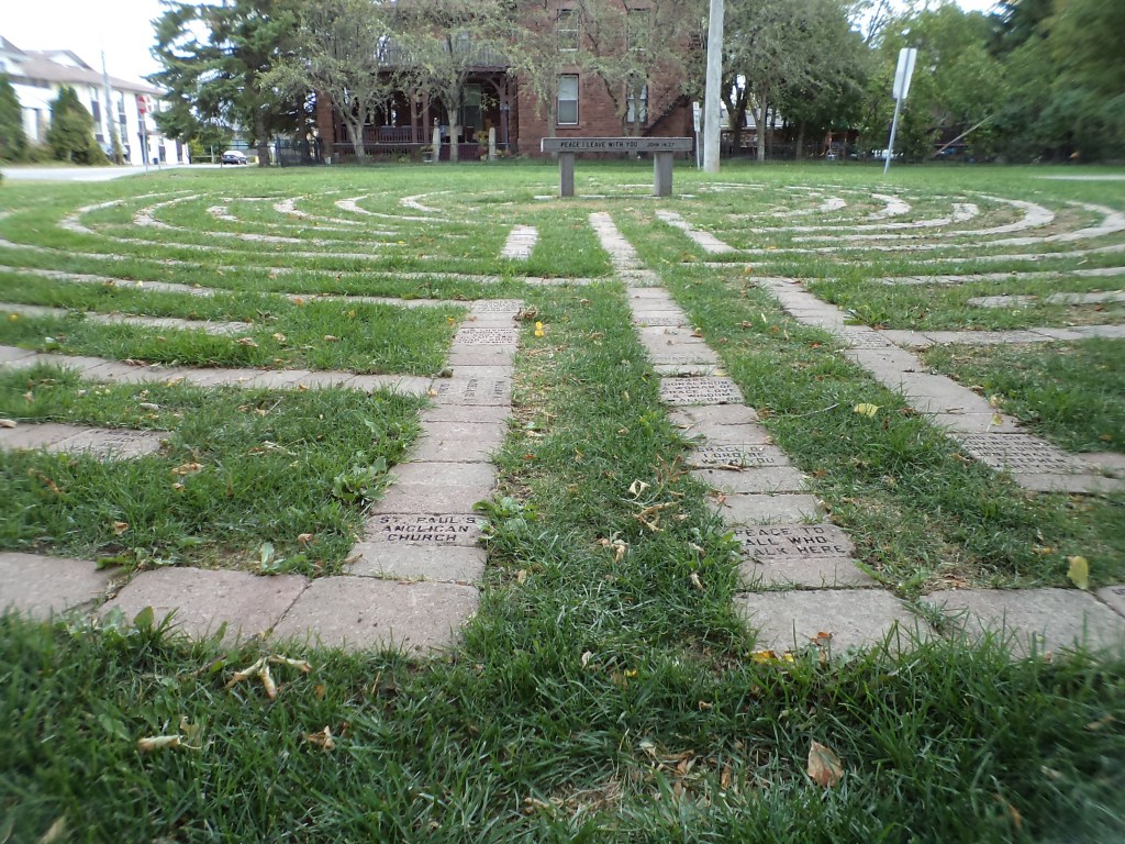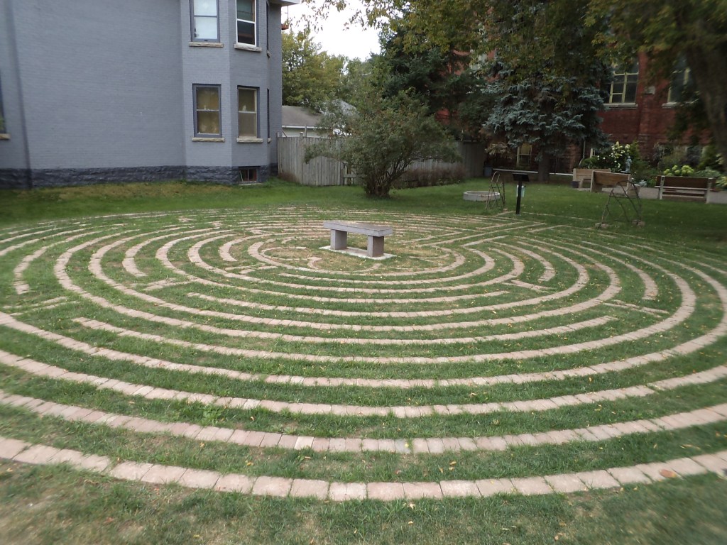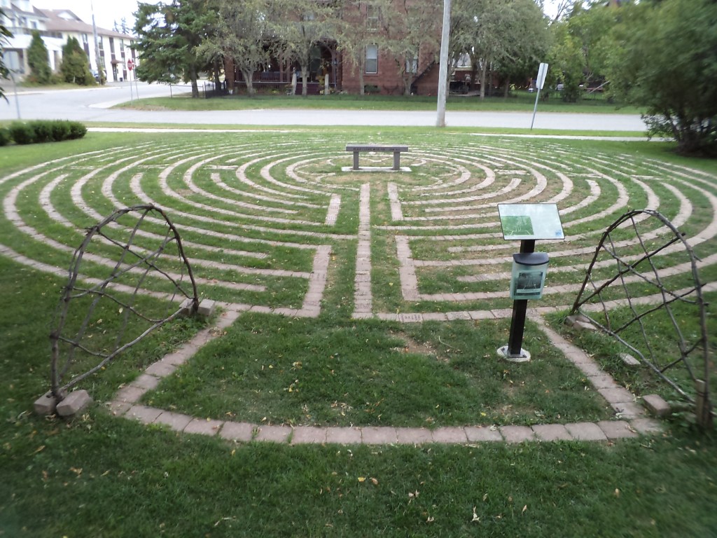 In Thunder Bay there is a delightful labyrinth at St Paul’s Anglican Church (a few pics from my visit above). Set amidst a quiet neighbourhood, they have set a full 11-circuit Chartres pattern labyrinth into the grounds. The path is delineated by bricks, many of which are inscribed with messages of love, peace, caring and remembrance.